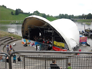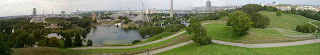 Aujourd'hui, brunch avec Anki en ville, puis visite à vélo de l'olympia park, lieu des jeux de Munich en 1972. Il y a tout plein d'animations, du cirque pour enfants au surf tracté par une tyrolienne sur le lac, et concert de musique classique. On monte sur une butte où l'on voit le parc dans son ensemble (l'architecture est restée très moderne) et la ville de Munich.