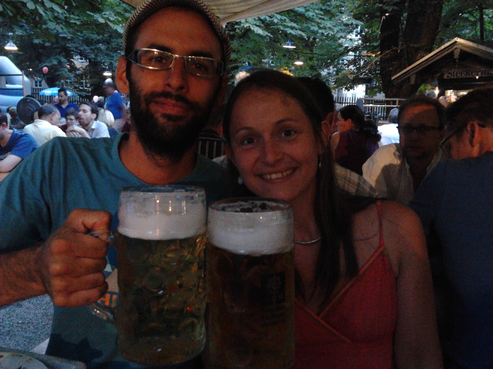 Puis Anki nous a emmené faire ce que font les munichois le soir : aller dans un bier garten d'une des brasserie de la ville. Des tables et des bancs en bois à perte de vue, et des centaines de litres de bière qui sont servis, l'unité la plus courante étant le litre. On est rentrés joyeux.