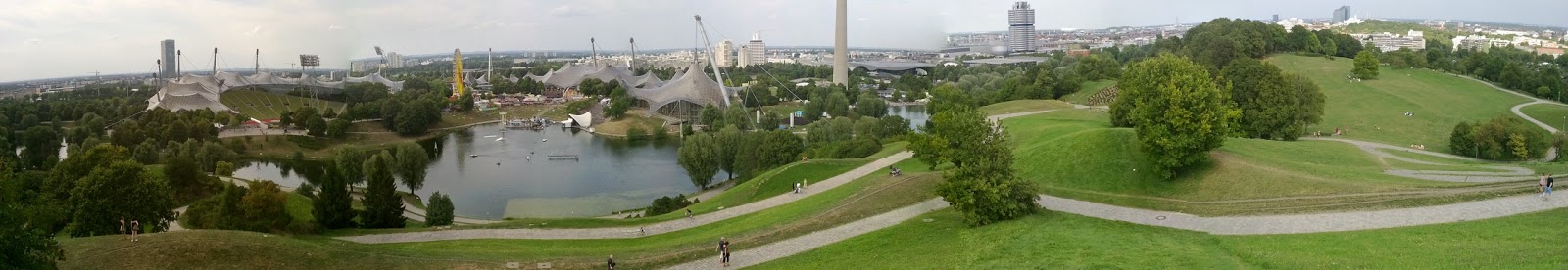 Aujourd'hui, brunch avec Anki en ville, puis visite à vélo de l'olympia park, lieu des jeux de Munich en 1972. Il y a tout plein d'animations, du cirque pour enfants au surf tracté par une tyrolienne sur le lac, et concert de musique classique. On monte sur une butte où l'on voit le parc dans son ensemble (l'architecture est restée très moderne) et la ville de Munich.