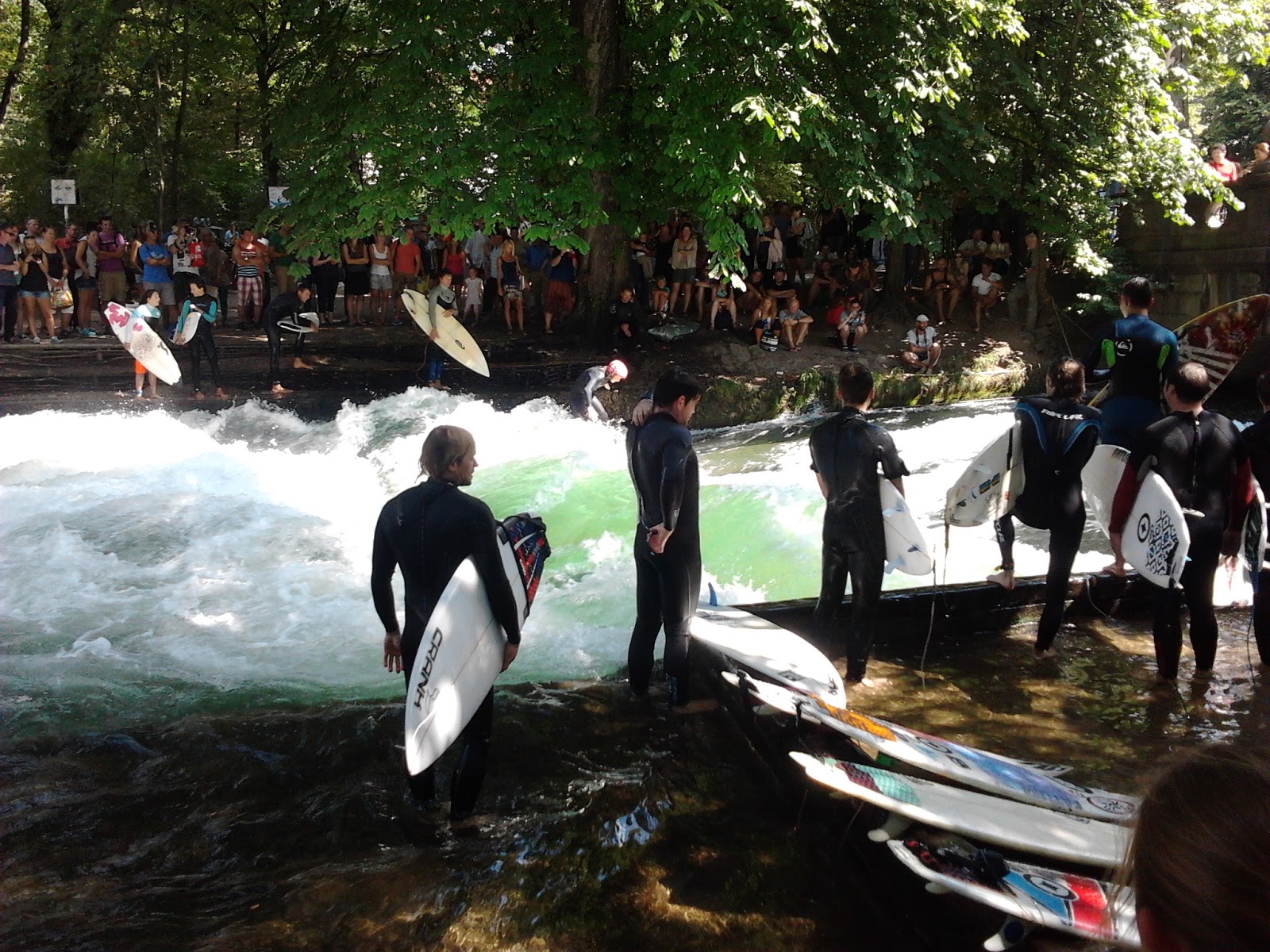 En particulier, l'englisch garten, où des surfeurs viennent s'amuser dans une vague artificielle créée sur une rivière. On a passé un bon moment à les observer hier après-midi (cf vidéo). Et dans le cours de la rivière où il y a un fort courant, de nombreuses personnes sautent pour se laisser porter un peu plus loin, et reviennent au point de départ par le tram, en maillot de bain : fun !