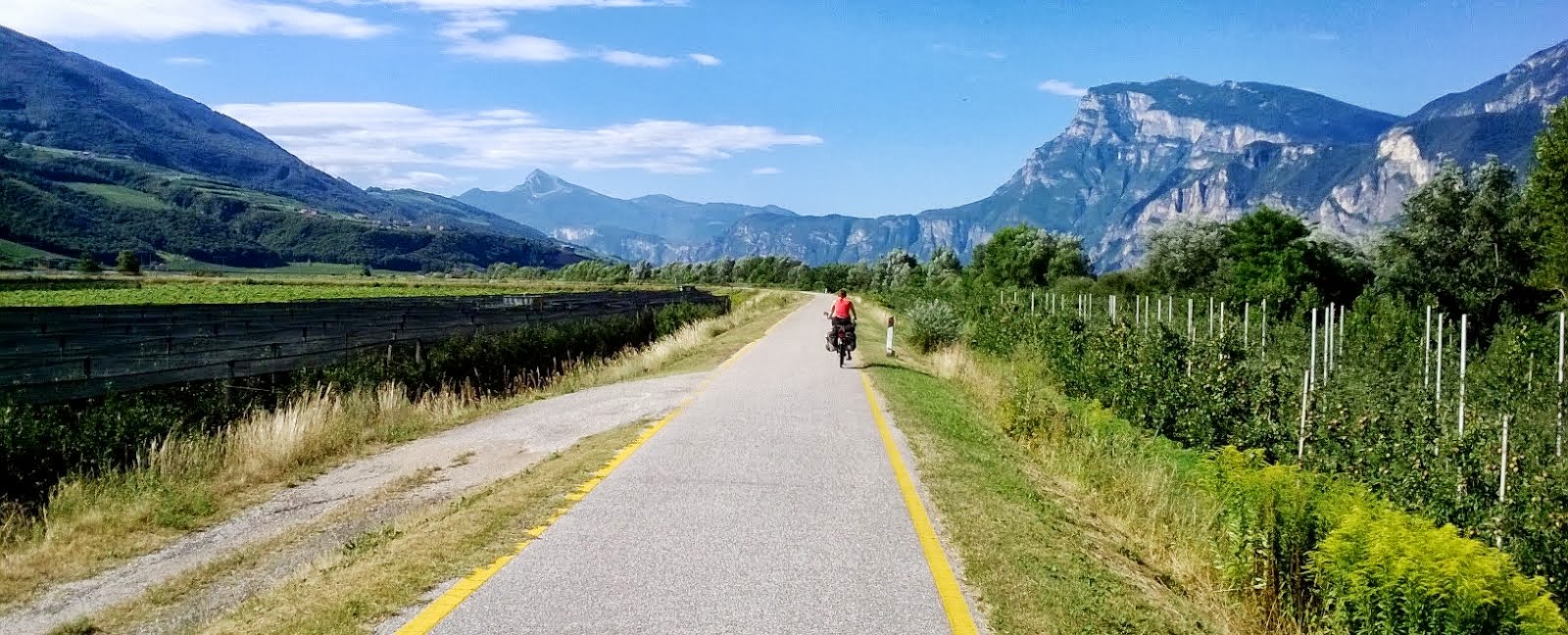 Bref, on prend donc le chemin le plus facile et bien indiqué, qui nous permet d'aligner les kms. En plus, c'est légèrement en descente et on a le vent dans le dos : on roule entre 20 et 30km/h, c'est du grand luxe ! En chemin, on croise un couple de cyclos allemands qui étaient au même camping que nous à Merano ; on s'arrête discuter un moment avec eux, c'est cool.
