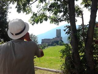Pour la suite de la route, on a quasiment que du plat ou de la descente. Les kilomètres défilent rapidement, à travers les pommiers. Car si hier nous étions dans un région de travail de bois et de carrières, c'est une ambiance très différente aujourd'hui avec des arbres fruitiers à perte de vue. Il y a même un petit stand self service de vente de jus de pommes et de fruits, au bord de notre via claudia augusta. Chaque village a son château, c'est super joli. D'ailleurs, la via Claudia Augusta antique semble passer par ces différents châteaux. On est toujours impressionnés par tous ces endroits où les romains était passé pour construire leur route.