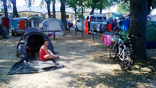 En route pour Mestre (le camping est là bas) on passe dans Noale, qui ressemble beaucoup à Citadella. On ne s'y attendais pas et c'est une belle surprise. Estelle va faire un brin de courses au supermarché du coin : elle ressort tout sourire "c'est trop bien ya un rayon entier de pâtes à perte de vue, pis ya plein de sauces qui ont l'air trop bonnes, pis...". Il faut dire que les pâtes constituent la base de notre nourriture de cyclos.